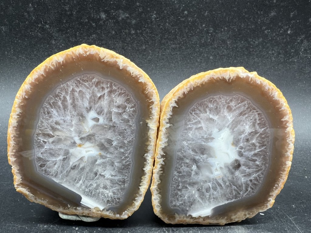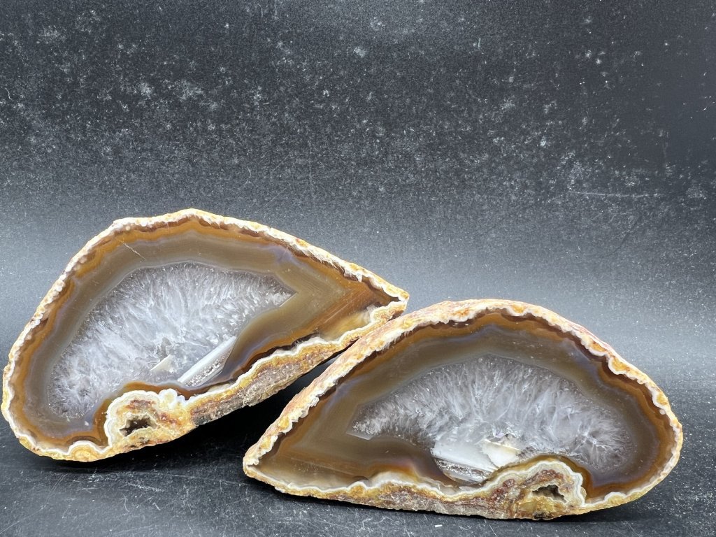 Objavte krásu prírodného achátu v unikátnej podobe dvoch vyleštených polovičiek z jednej geody. Tento produkt obsahuje 2 kusy achátu presne z rovnakého kameňa, ktoré k sebe patria.